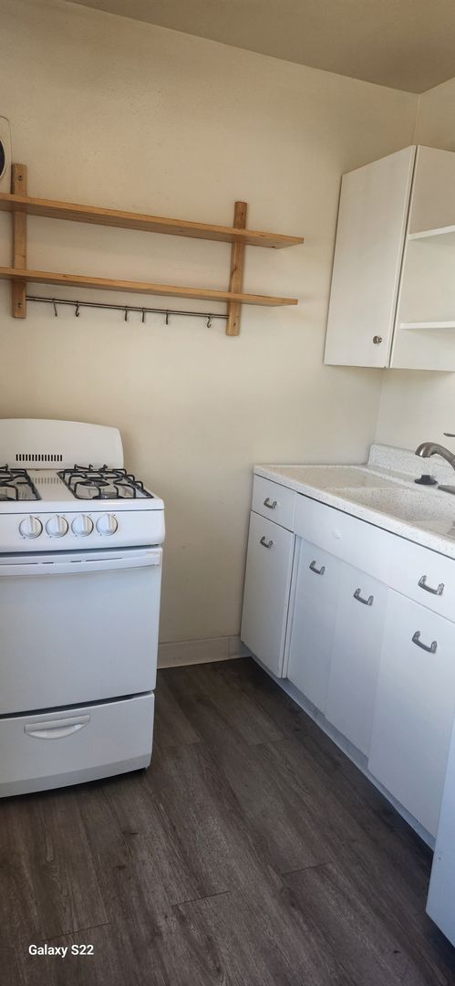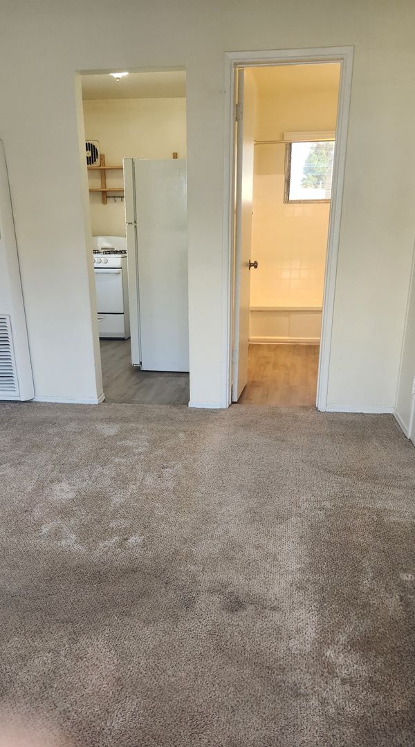Downstairs studio apartment is carpeted, has blinds in living room and kitchen windows. There is a large closet and the kitchen includes stove and refrigerator.