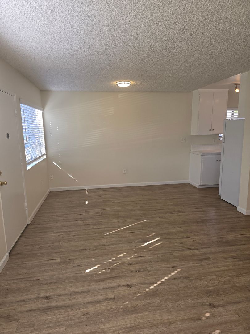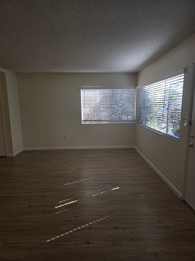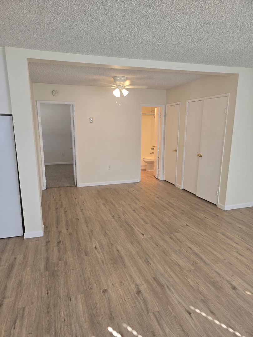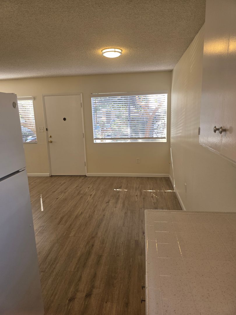 - Spacious Living/Dining Area: Bright and airy with ample natural light and large windows, two storage closets and a ceiling fan, hardwood style flooring.